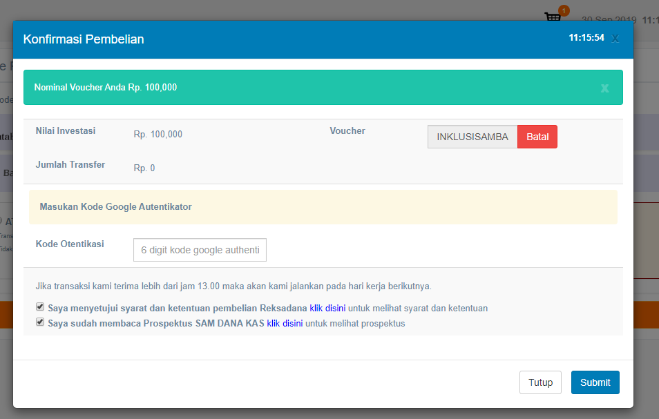 10. Pembelian Reksadana dengan voucher Berhasil, keterangan Transaksi pembelian berhasil dengan detail menggunakan voucher.